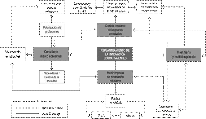 La finalidad de este artículo es exponer un modelo que replantee el uso de la innovación en las IES. Esta es la idea primaria que se ha explicado introductoriamente en la primera parte del artículo. Sin embargo, hay otros tantos elementos que son de vital importante para tener un mejor entendimiento del modelo que se presenta. En los párrafos venideros se hace mención de varios factores como la educación trans, multi e interdisciplinar, el marco contextual, el cambio o adaptación de la enseñanza y el impacto de esta. Además de introducir los elementos que conectan estos factores: el lean thinking y la apertura al cambio.