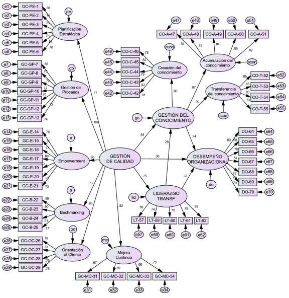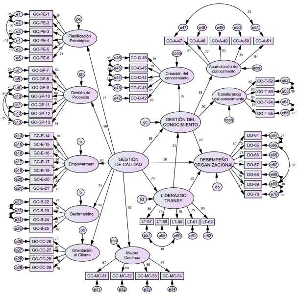 0.051 less than or equal to .07, GFI of 0.736 greater than or equal to .70, and CFI of .903 greater than or equal to .90, these indices reveal a very good adaptation of the structure and validation of the proposed model, as well as that all causal relations in the model (p-value <0.05) are statistically significant. Thus it is affirmed that the development of the organizational performance is affected by the interactions of the practices of quality management, knowledge management and transformational leadership